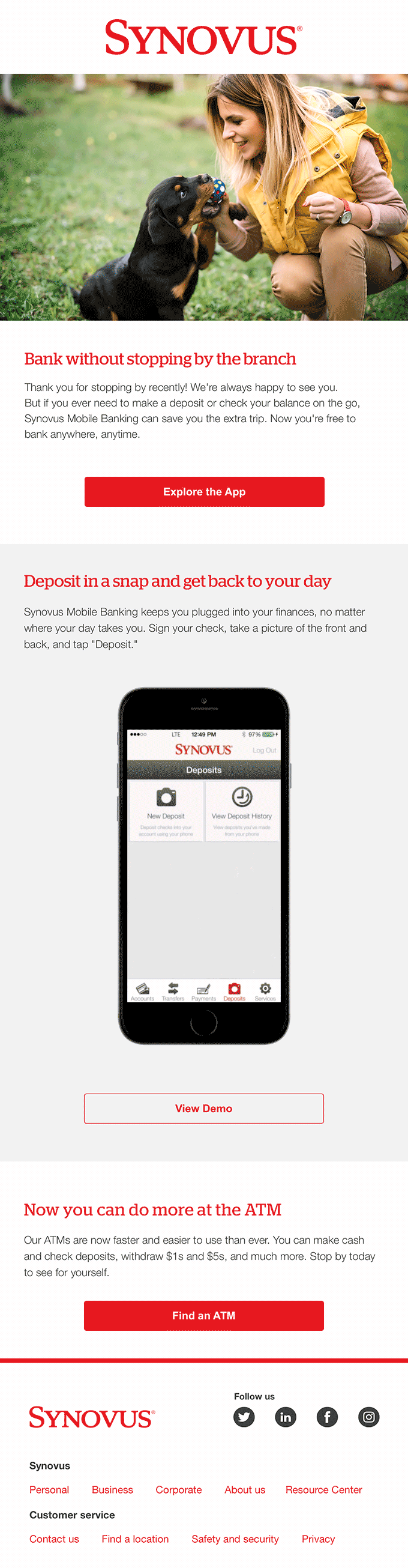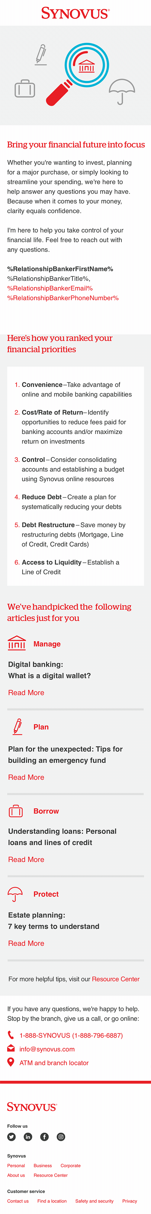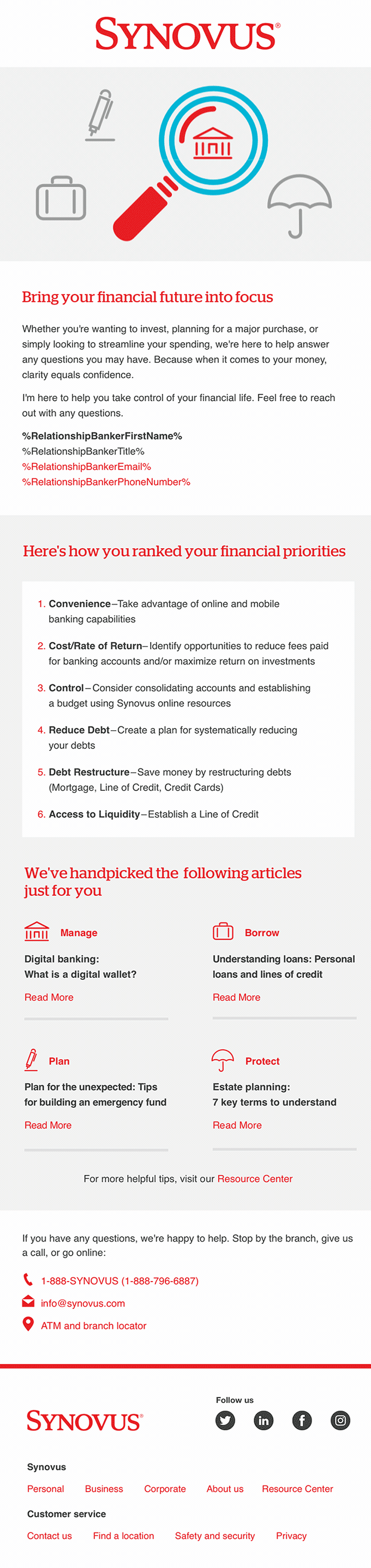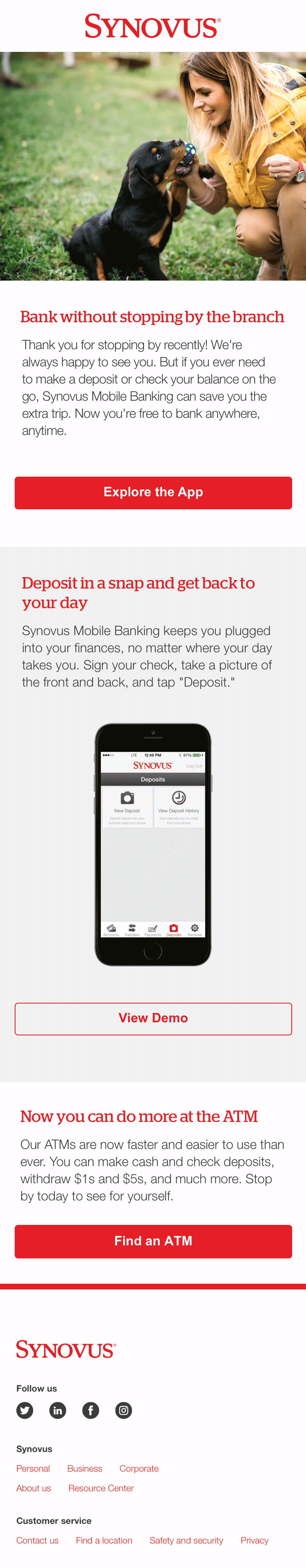Synovus wanted to think bigger when it came to communicating their values and offerings to their customers. From their new Inspire and Plus programs to their many targeted campaigns, we created a clean look and feel that resulted in high open rates, conversions and app downloads.